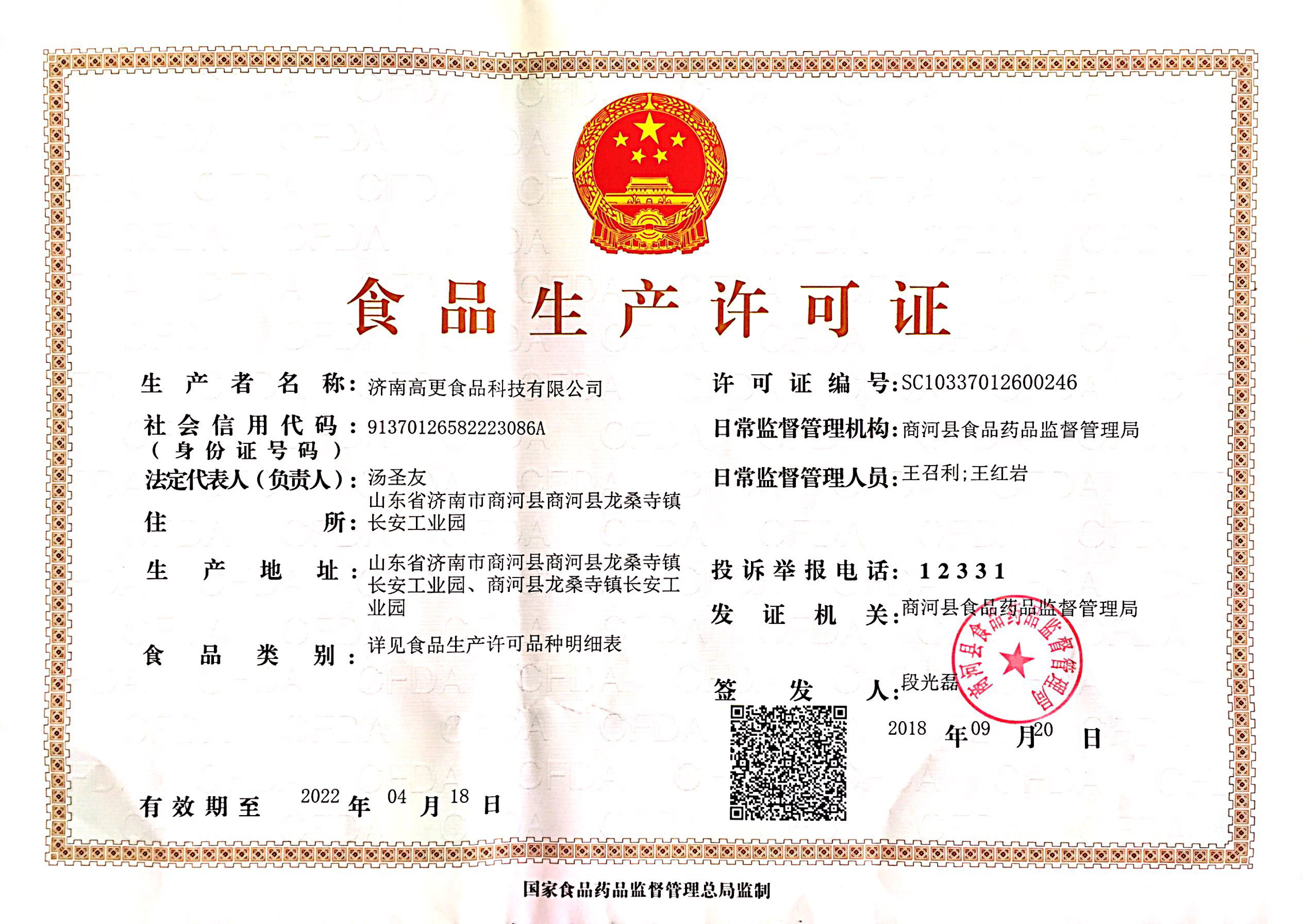 祝賀濟南高更獲得半固態(tài)食品生產(chǎn)許可證資質(zhì)